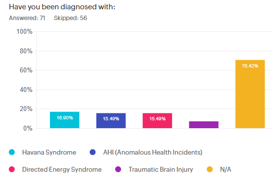 These are the results so far for civilians experiencing Sudden Abnormal Neurological (AHI, Havana Syndrome) like Symptoms and Injuries. Survey closes September 15, 2026. Get counted today